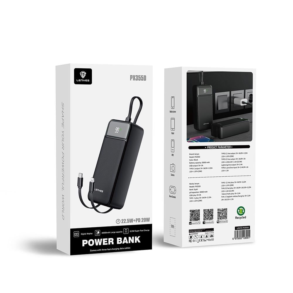 باور بانك Lenyes PX355D بشاشة LED رقمية وكابل Type-C وLightning بقوة 22.5 وات وسعة 30000 مللي أمبير في الساعة