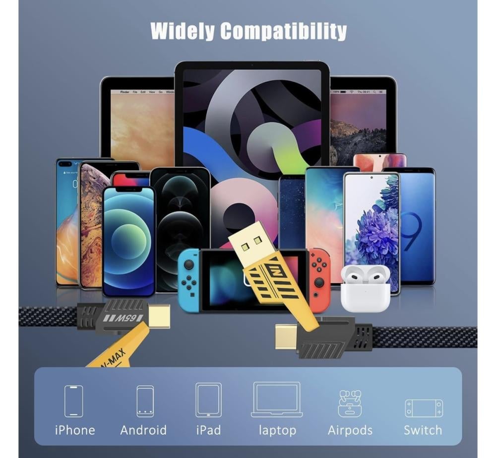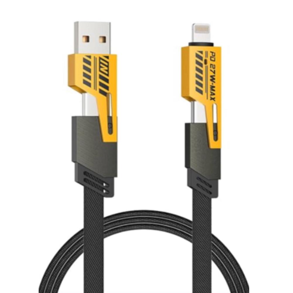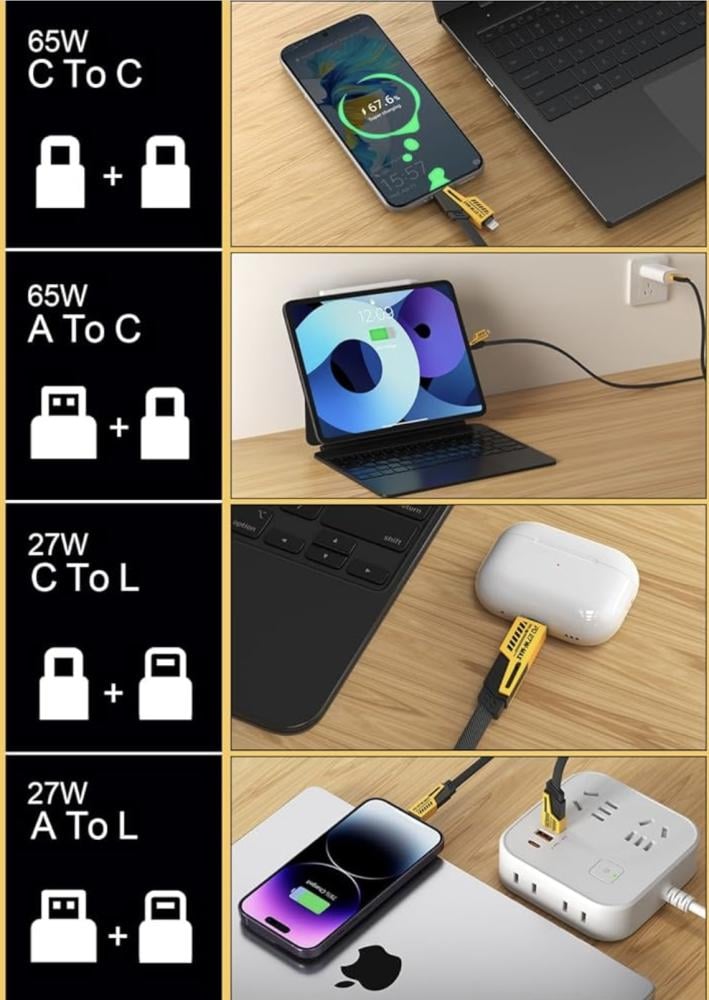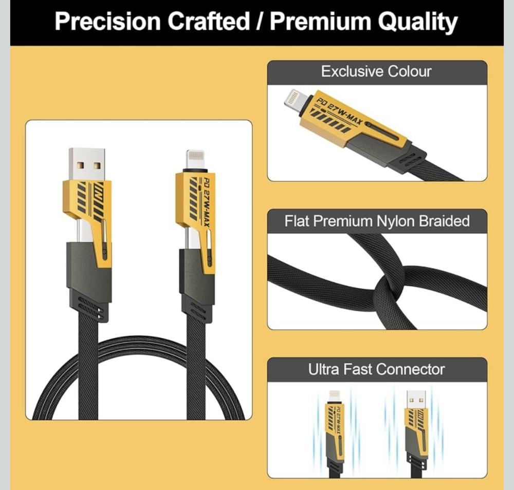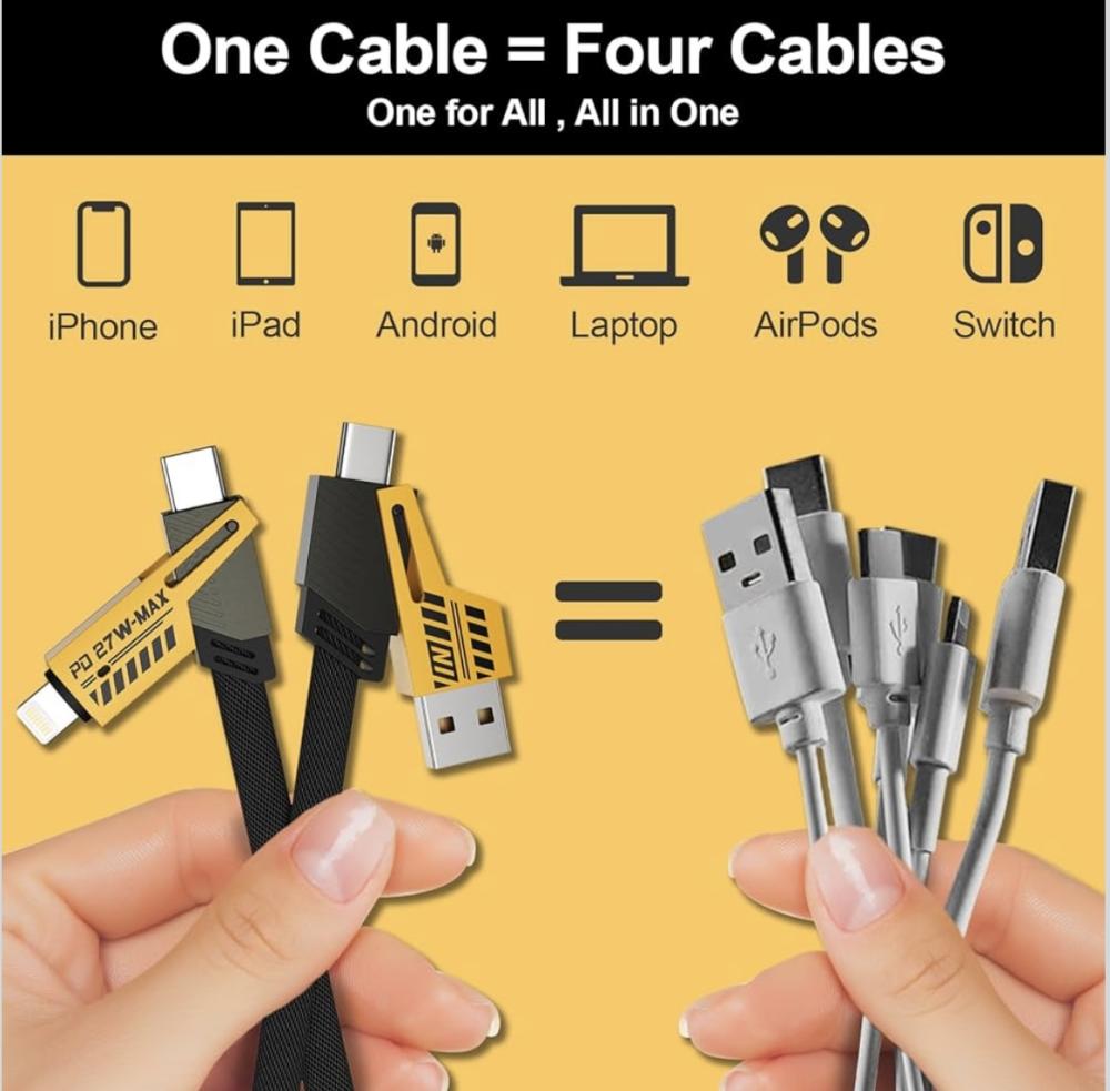 شحن سريع ومزامنة بيانات: يدعم هذا الكابل 4 في 1 الشحن السريع ونقل البيانات، موفرًا تيار شحن يصل إلى 27 واط كحد أقصى، وهو 65 واط للهواتف أو أجهزة iPad Pro أو MacBook Pro. يمكنه شحن هاتفك حتى 50% في 30 دقيقة فقط.